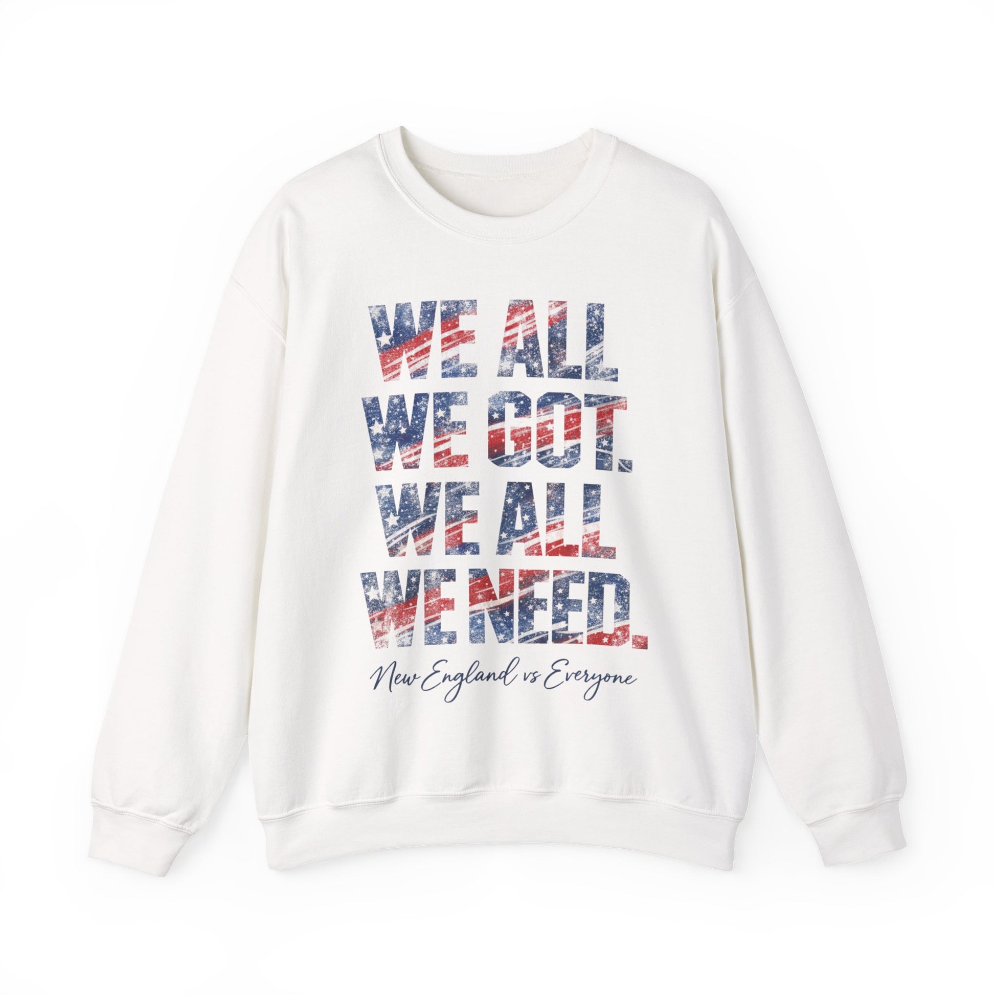 This vintage-inspired crewneck features bold, distressed lettering filled with a weathered red, white, and blue pattern, finished with “New England vs Everyone” in soft script beneath. Designed to feel like your favorite worn-in sweatshirt from day one-cozy, timeless, and unapologetically New England.